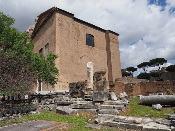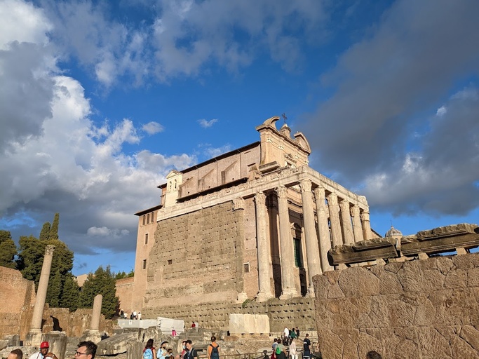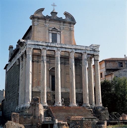 Ancient Roman temple built by Emperor Antoninus on his wife's death in 141 AD, with noted frieze.