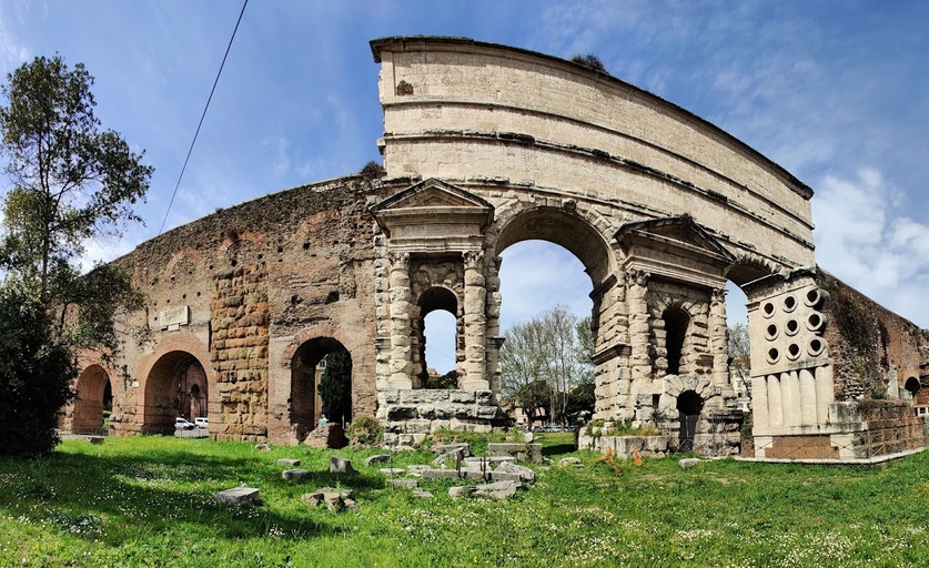 Double-arched gateway, in Rome's 3rd-century city wall, with 2 aqueducts & a Latin inscription.