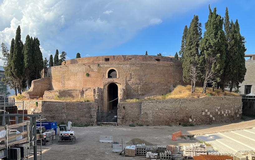 Remains of Roman emperor's circular, raised tomb, originally a grand monument with a bronze statue.