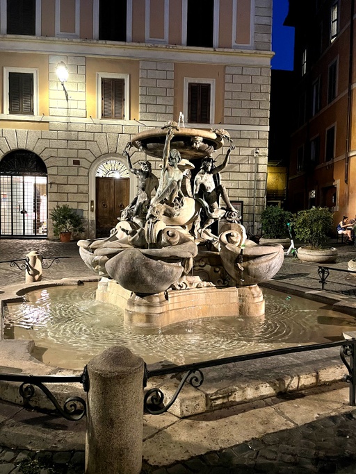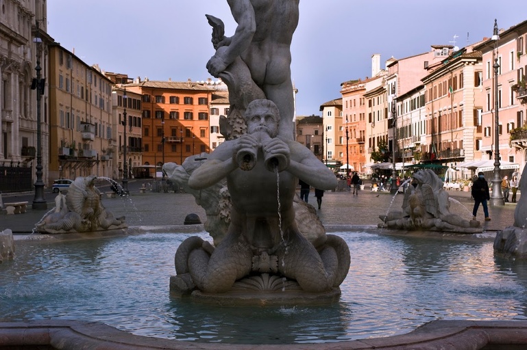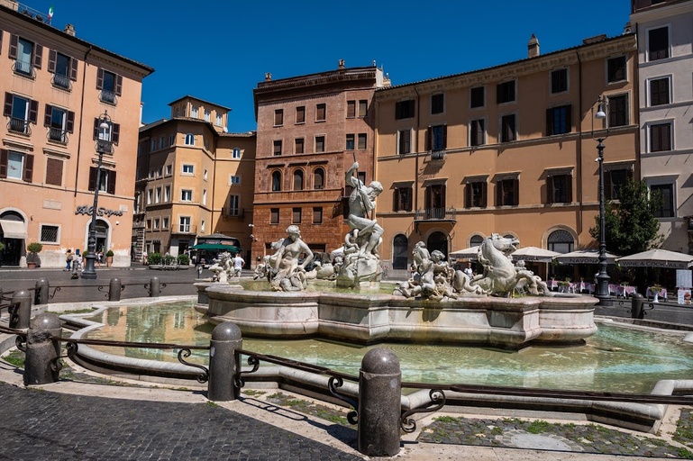 Renovated 16th-century marble fountain in the Piazza Navona featuring dolphin & Triton sculptures.
