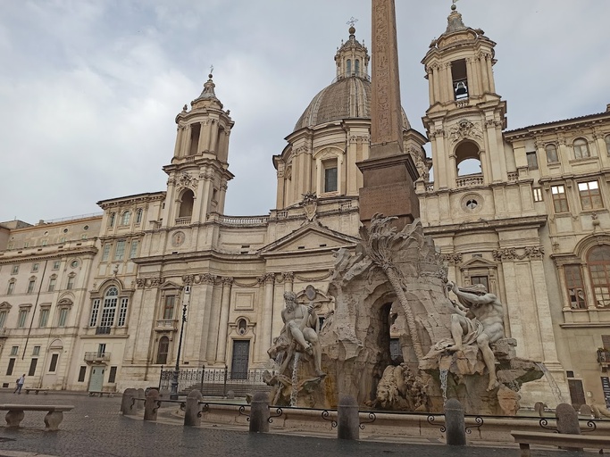 Piazza Navona, a Baroque masterpiece in Rome's Rione Parione, features Bernini's stunning Fountain of the Four Rivers, representing major world rivers. Originally a chariot stadium, it now hosts street artists and bars, with additional fountains like the Moor and Neptune adding to its charm.