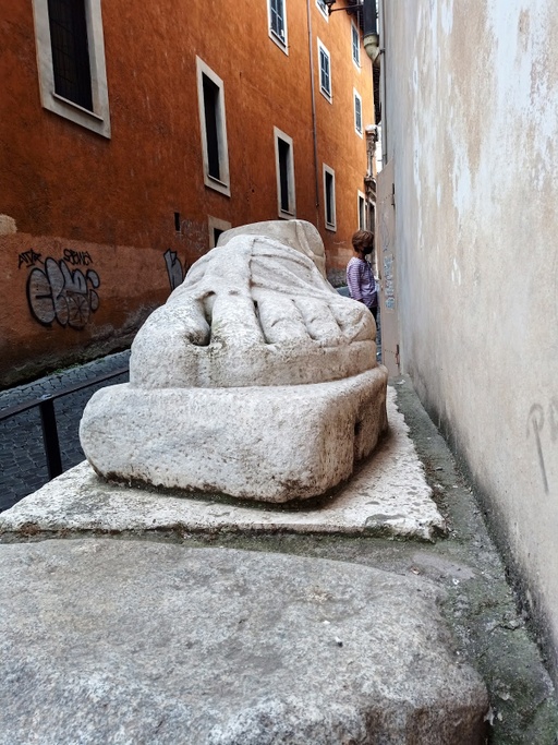 Large restored marble foot complete with sandal, the remains of an ancient Roman statue.