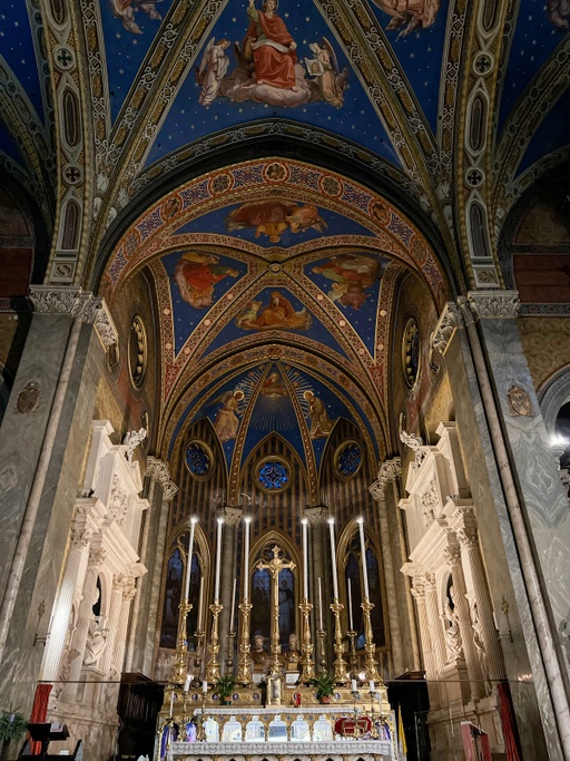1400s church with curving porticoed facade, plus frescoes by Raphael & elegant, 2-tiered cloisters.