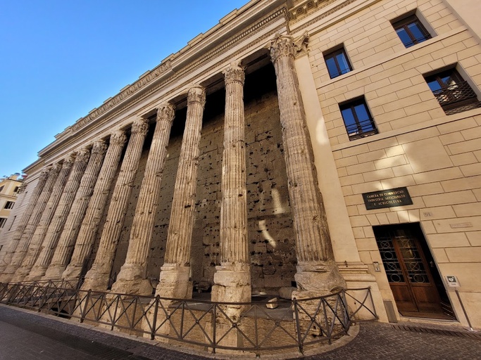 Roman temple from 145 AD with 11 Corinthian columns standing, now facade of Rome's stock exchange.