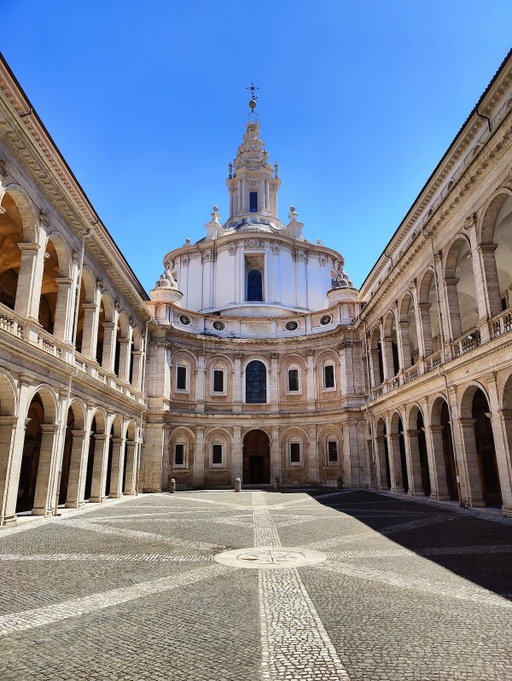 Church by Baroque master Borromini with a spiral lantern & a unique, geometrically complex interior.