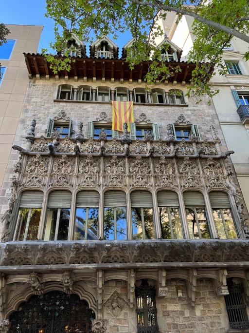 1906 modernist palace by architect Josep Puig, featuring ornate Gothic & Arabesque-inspired details.