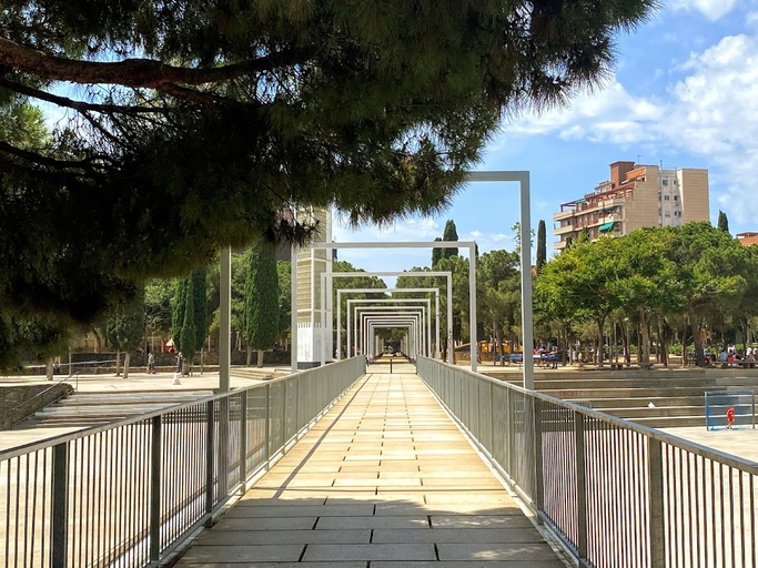 City park designed by architect Jean Nouvel, featuring modern landscape elements & play structures.