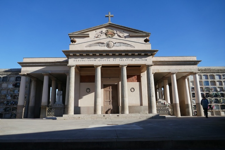 Cemetery with artfully sculpted tombs, including the a winged skeleton known as the "Kiss of Death".