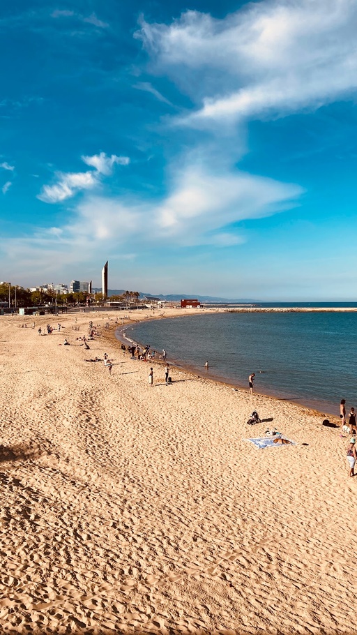 Large, bustling beach featuring a wide stretch of sand used for volleyball, sunbathing & more.